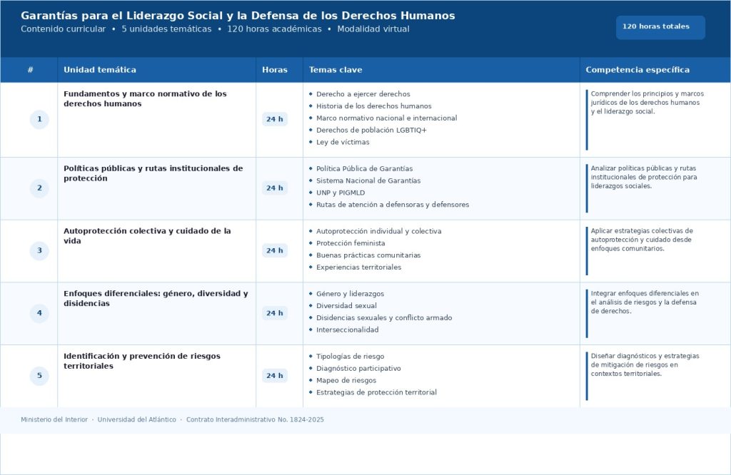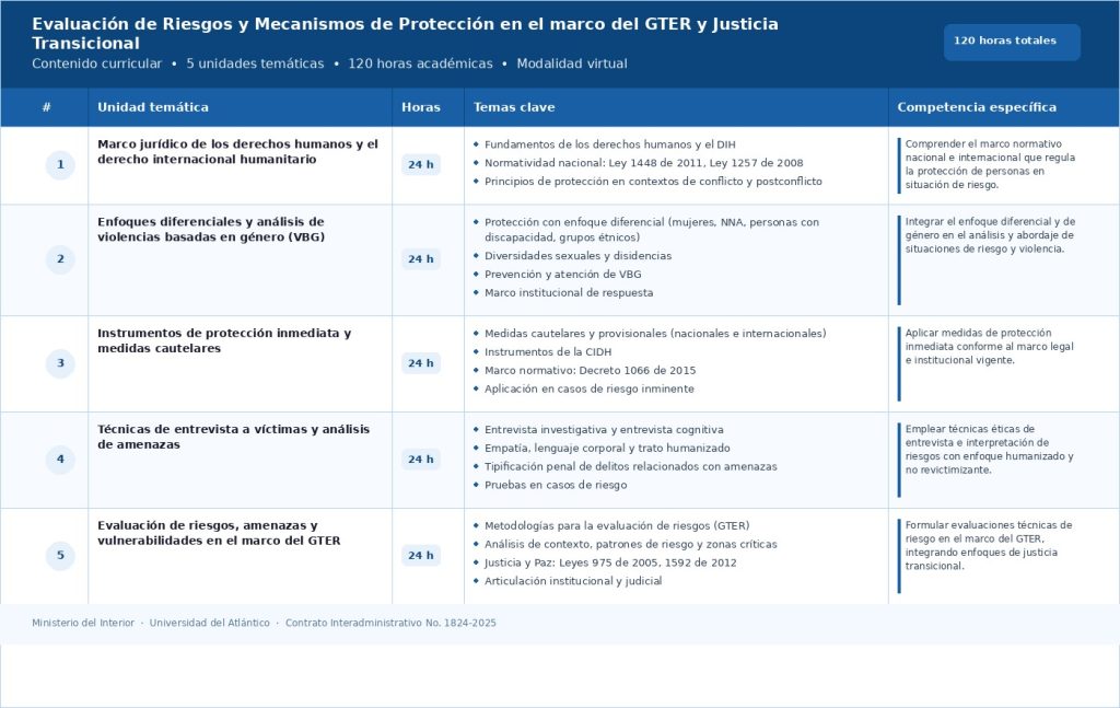 Al finalizar, cada participante recibirá una certificación por parte del Ministerio del Interior y la Universidad del Atlántico, que acredita las 120 horas académicas que componen el diplomado. Esta formación se organiza en tres diplomados, cada uno estructurado en 5 unidades temáticas de 24 horas cada una. A continuación, se presenta el contenido curricular de cada uno: